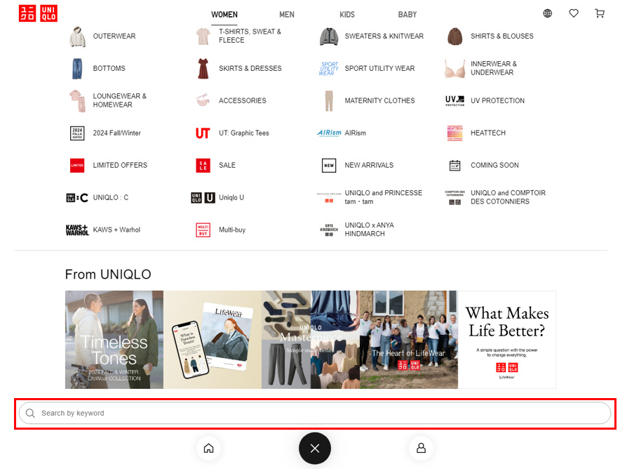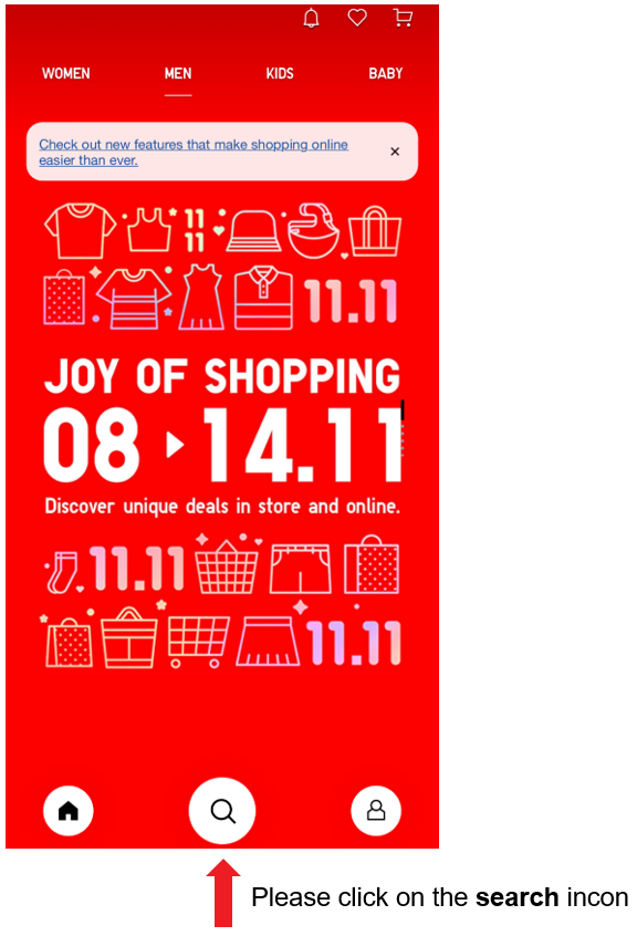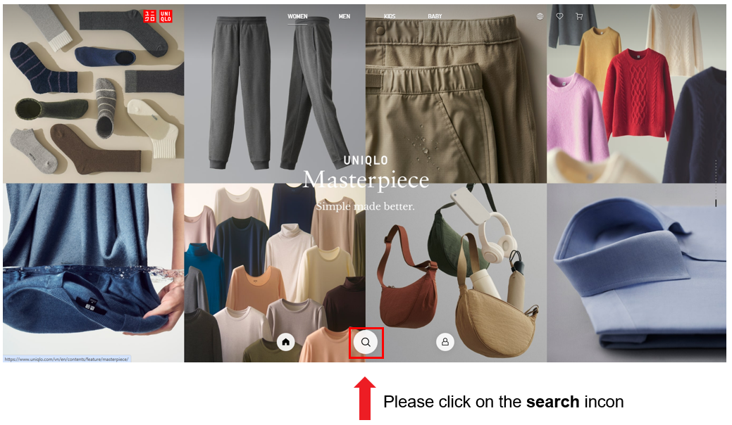 You can find your desired product by categories on UNIQLO Vietnam website/ UNIQLO App, or you can enter the product code/name in the "search" bar, please refer as below: