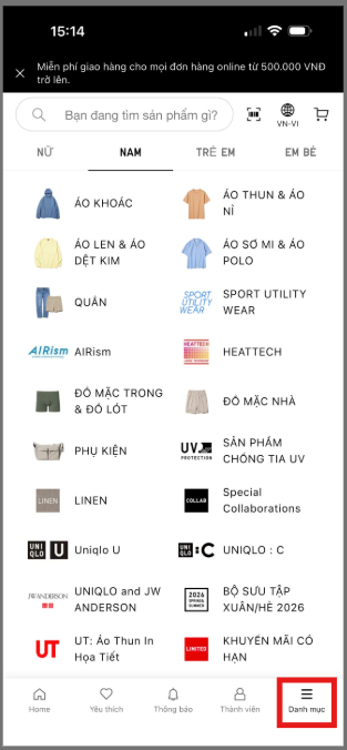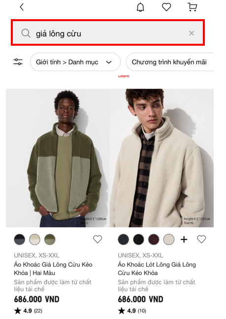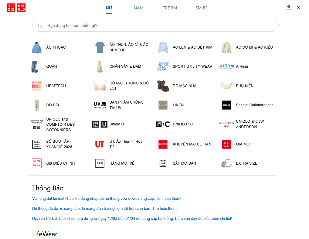 Quý khách vui lòng tìm sản phẩm mong muốn theo các danh mục trên trang web của UNIQLO Việt Nam/ Ứng dụng Uniqlo. Ngoài ra, khách hàng cũng có thể tìm kiếm theo chức năng hoặc nhập mã/ tên sản phẩm vào thanh "Tìm kiếm", quý khách có thể tham khảo các bước sau đây: Bước 01: Truy cập Website/App UNIQLO Việt Nam