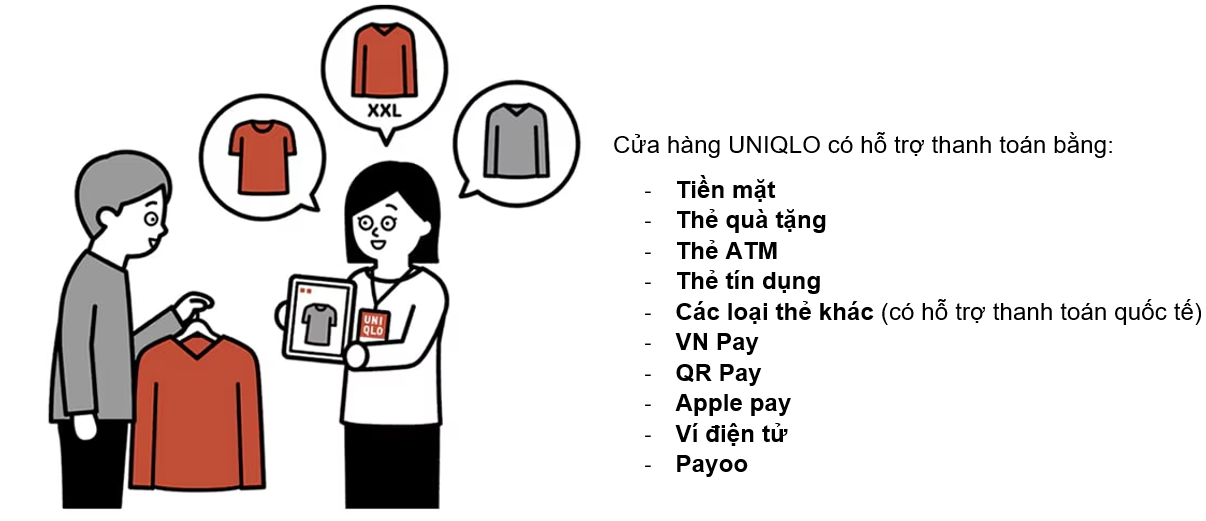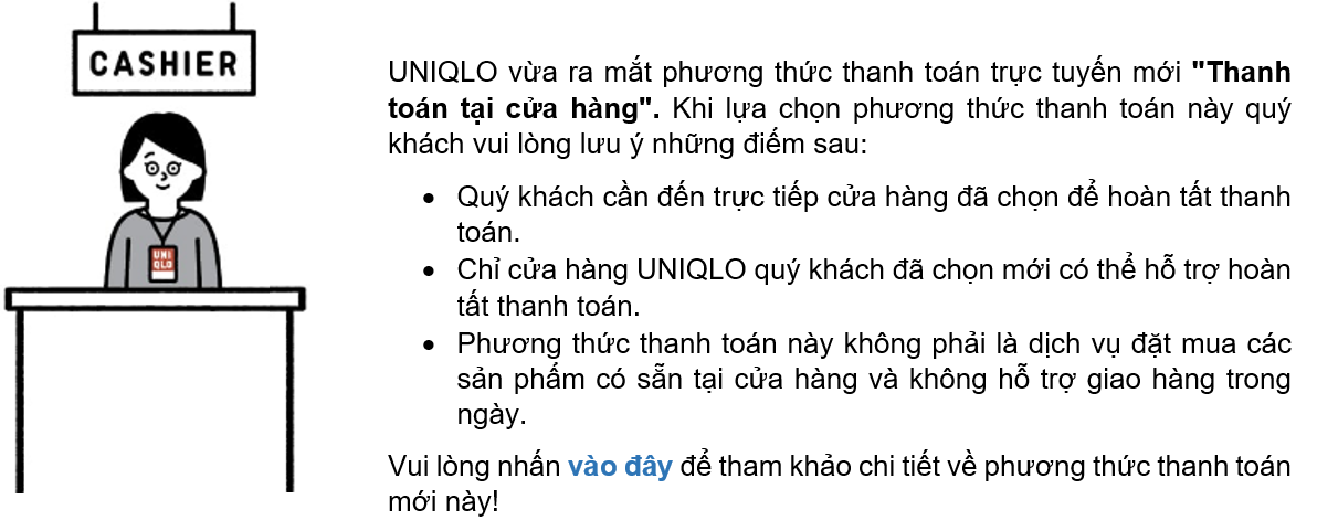 Hiện tại, để hỗ trợ quý khách tiện lợi hơn khi mua sắm cùng UNIQLO Việt Nam, quý khách có thể sử dụng các phương thức thanh toán sau: