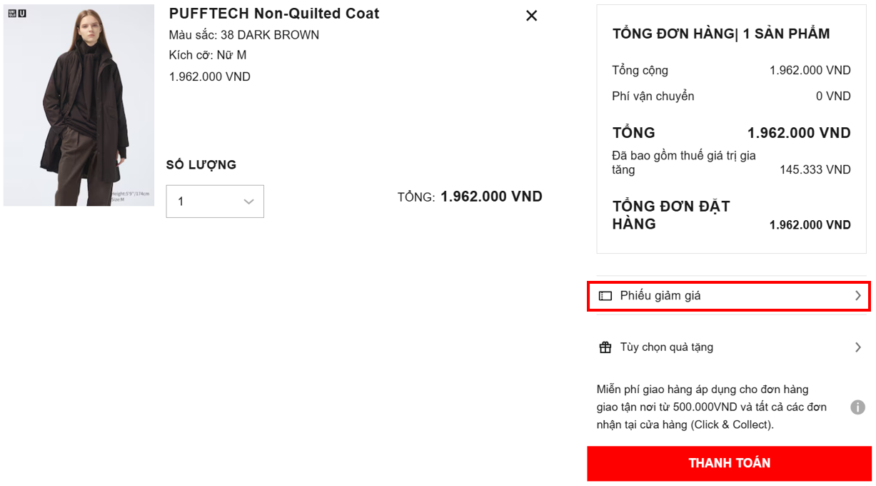 Bước 3. Bạn có thể xem lại tóm tắt đơn đặt hàng và áp dụng [PHIẾU GIẢM GIÁ] nếu bạn có Phiếu giảm giá trong tài khoản của mình.