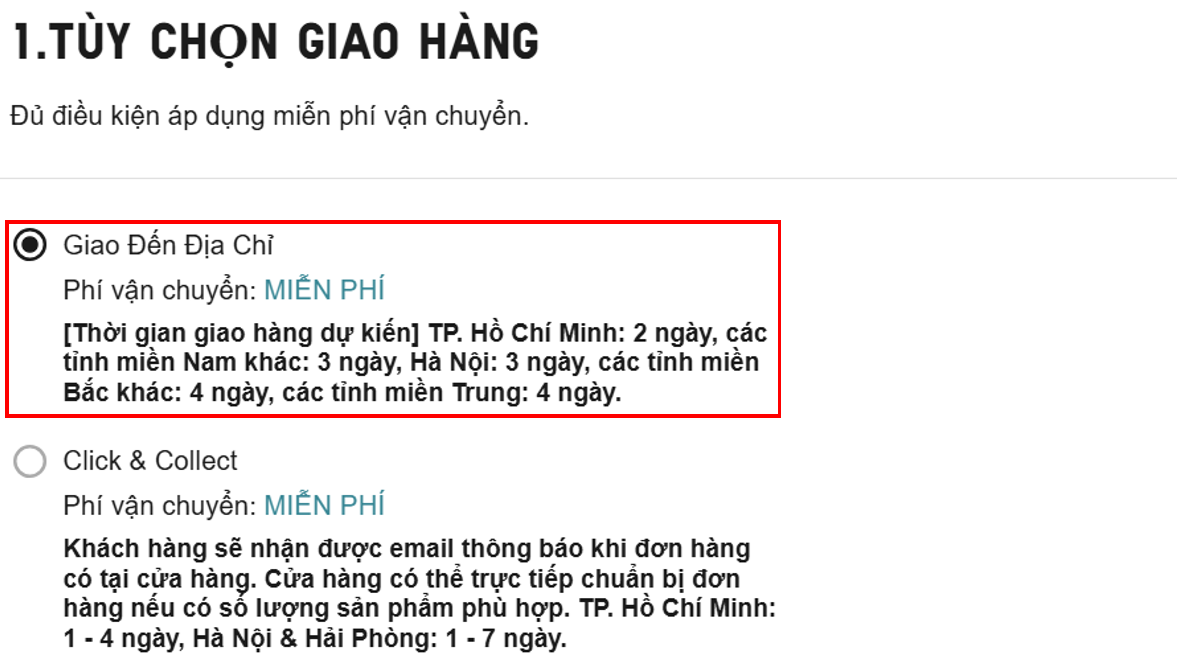 Bước 5. Chọn phương thức giao hàng. Hiện tại chúng tôi có 2 lựa chọn giao hàng dưới đây. Xin lưu ý, một khi bạn đã hoàn thành đơn đặt hàng, chúng tôi chưa thể hỗ trợ thay đổi phương thức giao hàng.