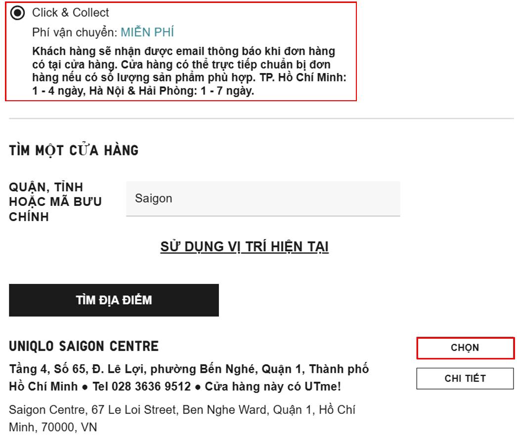 Chọn cửa hàng mà bạn muốn đến nhận kiện hàng. Nhấn chọn [LẤY HÀNG TẠI CỬA HÀNG NÀY] và tiếp tục các bước tiếp theo.