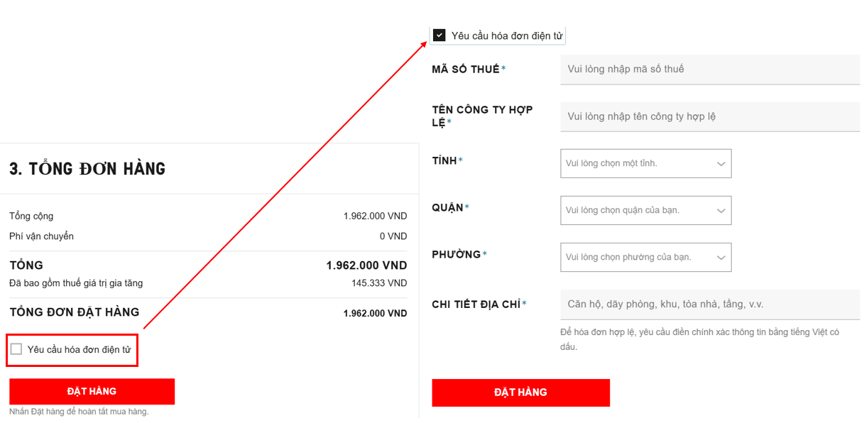 Xin lưu ý, hóa đơn điện tử chỉ được thực hiện khi bạn ấn chọn vào ô vuông, chúng tôi rất tiếc khi chưa thể thực hiện xuất hóa đơn nếu bạn hoàn thành đơn hàng mà chưa nhập liệu thông tin công ty.