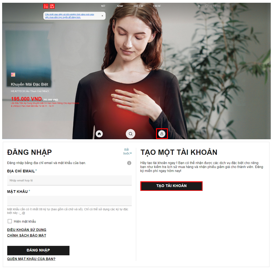 Bước 1. Tại trang web/ App Uniqlo Việt Nam, vào mục "Đăng nhập" và nhấn vào [TẠO TÀI KHOẢN]