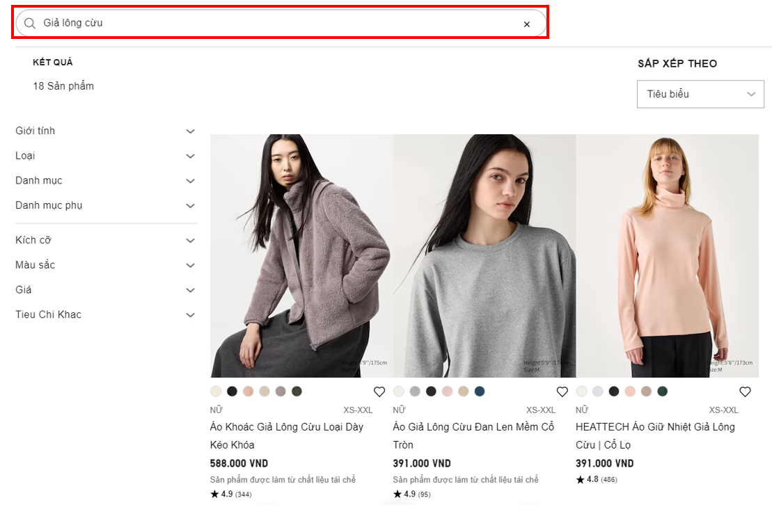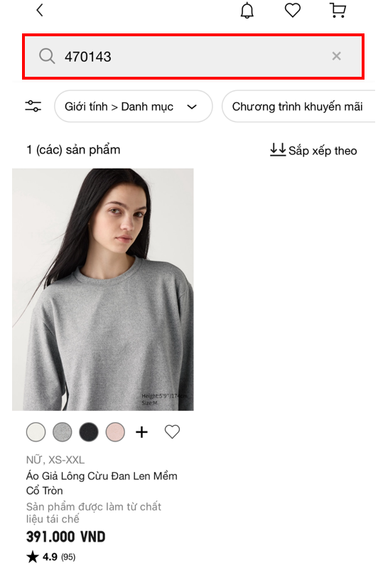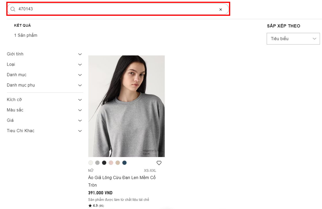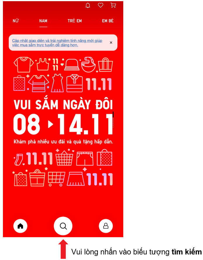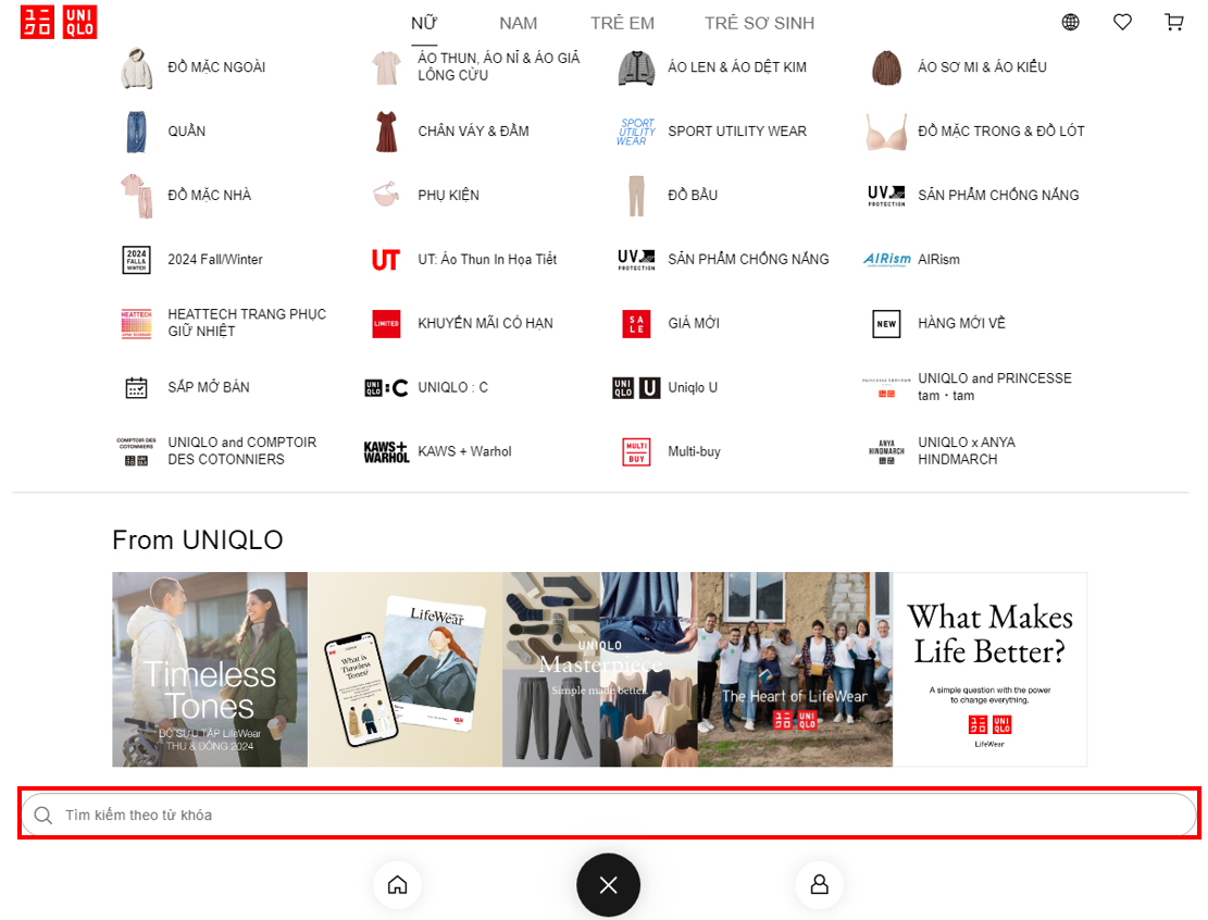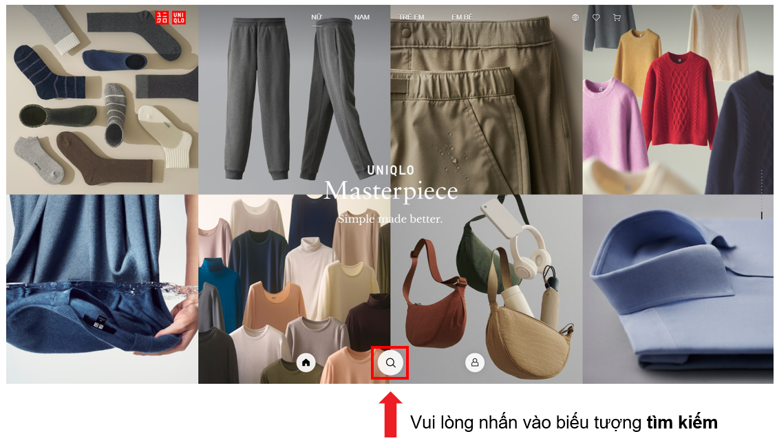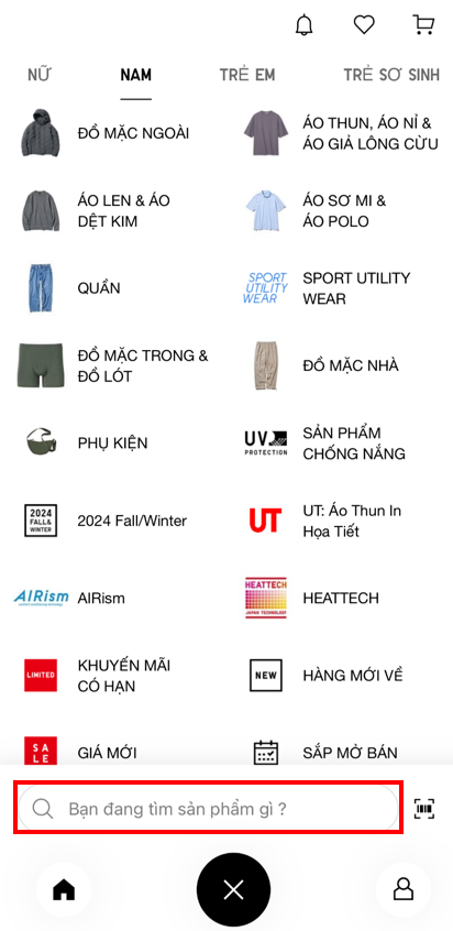 Quý khách vui lòng tìm sản phẩm mong muốn theo các danh mục trên trang web của UNIQLO Việt Nam/ Ứng dụng Uniqlo. Ngoài ra, khách hàng cũng có thể tìm kiếm theo chức năng hoặc nhập mã/ tên sản phẩm vào thanh "Tìm kiếm", quý khách có thể tham khảo các bước sau đây: Bước 01: Truy cập Website/App UNIQLO Việt Nam