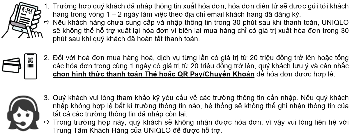 • Vì vậy, Uniqlo rất mong quý khách lưu ý khi xuất hóa đơn điện tử, quý khách vui lòng giữ lại biên lai hóa đơn nhằm có thể hỗ trợ Uniqlo thực hiện thông báo điều chỉnh hóa đơn nếu như thông tin bị sai sót.