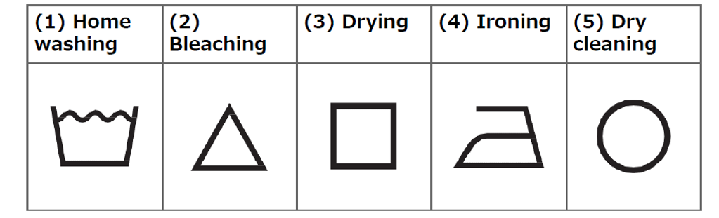 The handling instruction symbols are different combinations of the basic symbols and modifiers. (1) to (5) are printed on the care label in that order.