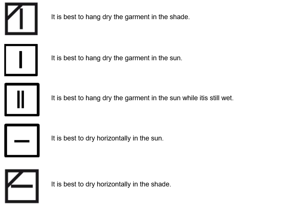 The air-drying symbols indicate the drying method, whether spin cycles are needed, and where to dry the garment.