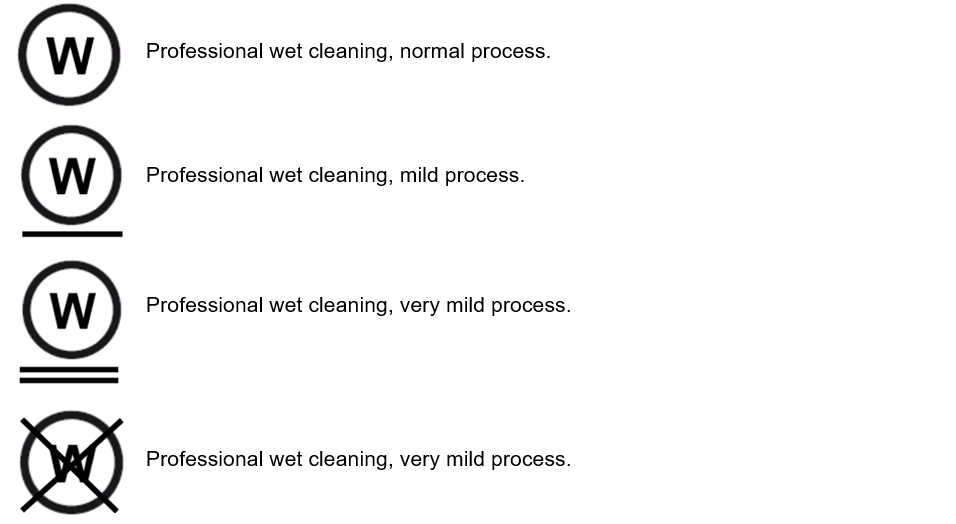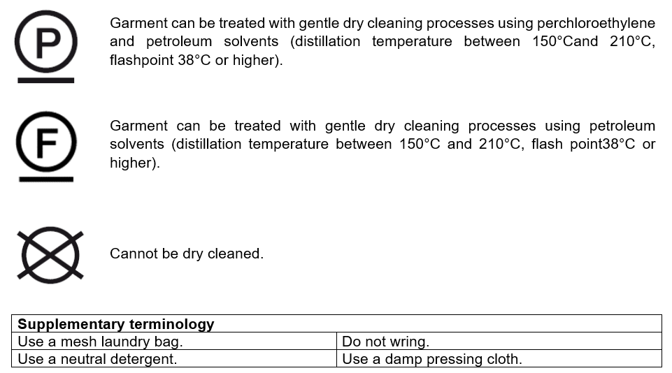 Indicates the method of dry cleaning to be used at a dry cleaner.