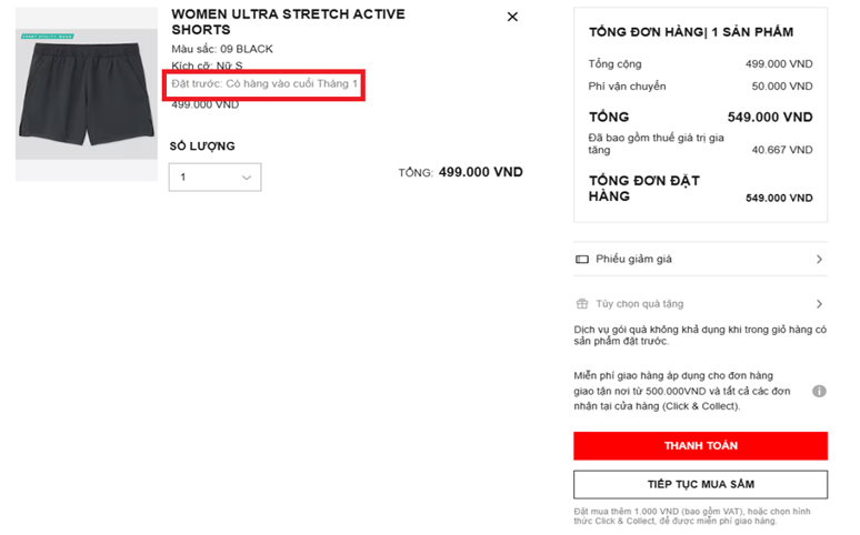 2. Trong giỏ hàng, ngày giao hàng dự kiến sẽ được hiển thị ở mục Đặt trước.