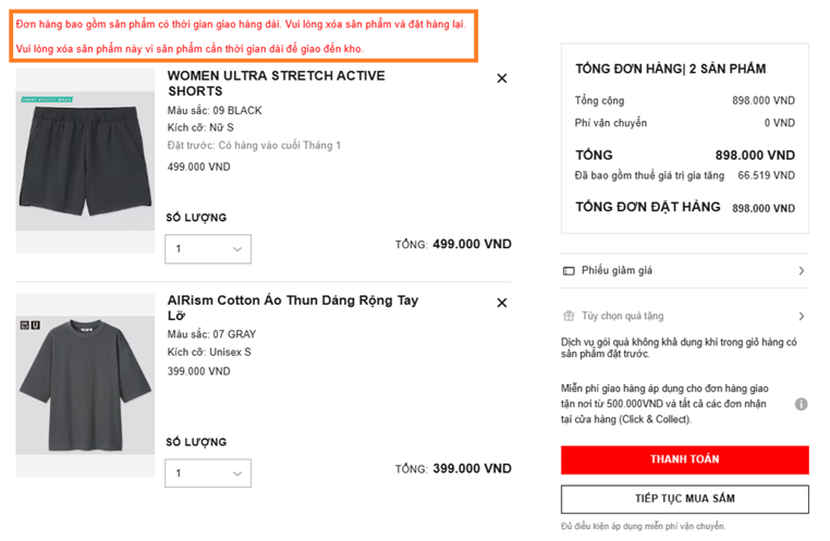 Nếu thời gian mở bán mặt hàng Đặt hàng trước hơn bảy (7) ngày, bạn không thể thanh toán chung với các mặt hàng có sẵn (như hình ảnh bên dưới). Vì vậy, hãy đặt riêng đơn hàng theo từng loại hàng có sẵn và mặt hàng Đặt hàng trước.