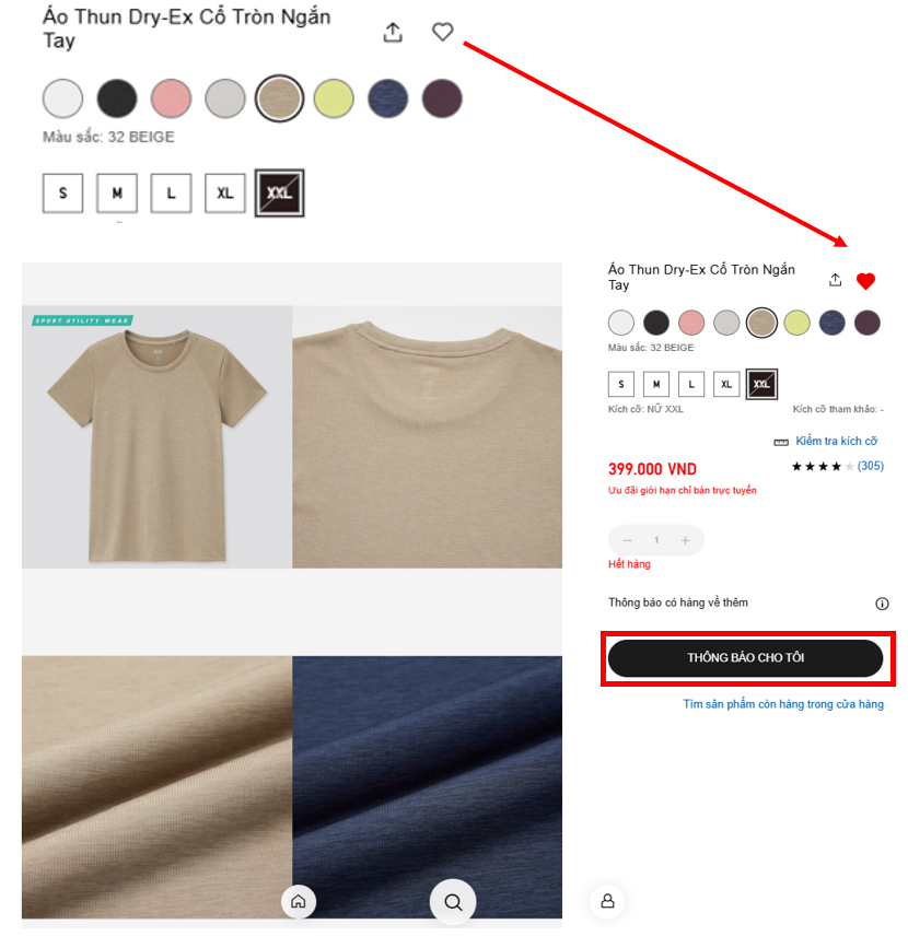 Bước 01: Nhấp vào biểu tượng "Trái Tim" tại trang sản phẩm, sau đó nhấn nút "Thông báo cho tôi"