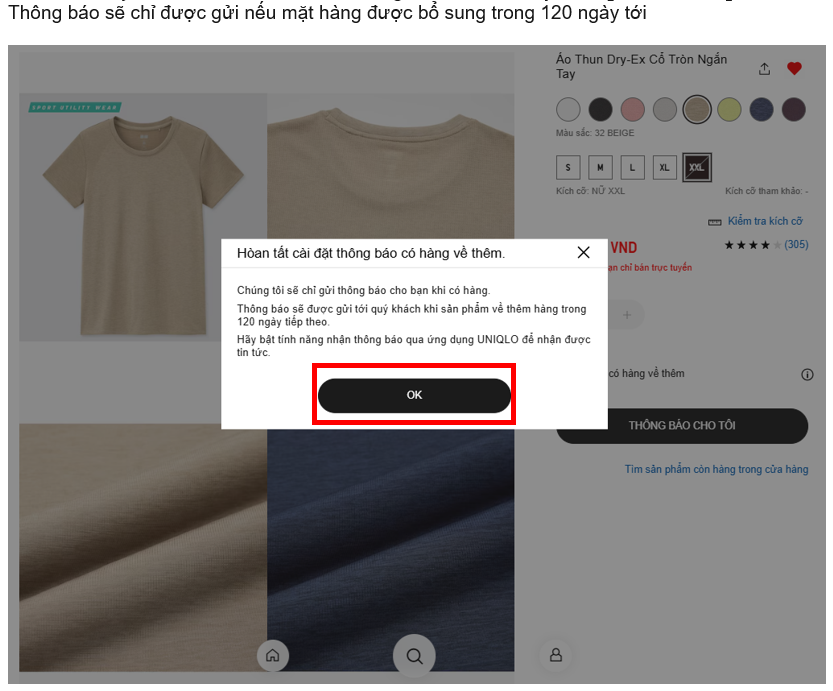 Bước 04: Bạn sẽ thấy màn hình xác nhận có nội dung "Hoàn tất cài đặt thông báo có hàng về thêm"