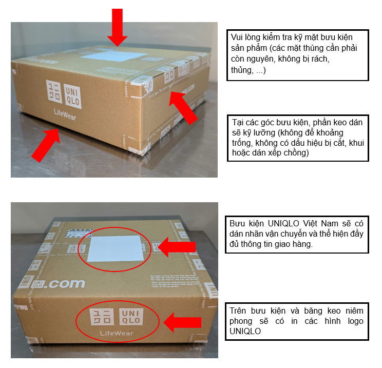 - Trong trường hợp quý khách không thể nhận hàng trực tiếp, UNIQLO khuyến nghị sử dụng phương thức thanh toán trước (Thẻ ATM/Thẻ tín dụng/Thẻ ghi nợ). Hoặc yêu cầu nhân viên giao hàng cung cấp thông tin về kiện hàng, bao gồm: Mã đơn hàng, mã vận chuyển,... (Nhân viên giao hàng phải cung cấp được thông tin giao hàng để đối chiếu và quý khách không chủ động cung cấp thông tin cá nhân hoặc thông tin đơn hàng cho nhân viên giao hàng).