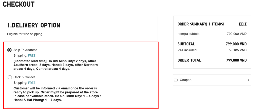 - Click & Collect: Estimated delivery time in Ho Chi Minh City will range from 01 - 04 days and in Hanoi & Hai Phong will range from 01 - 07 days.