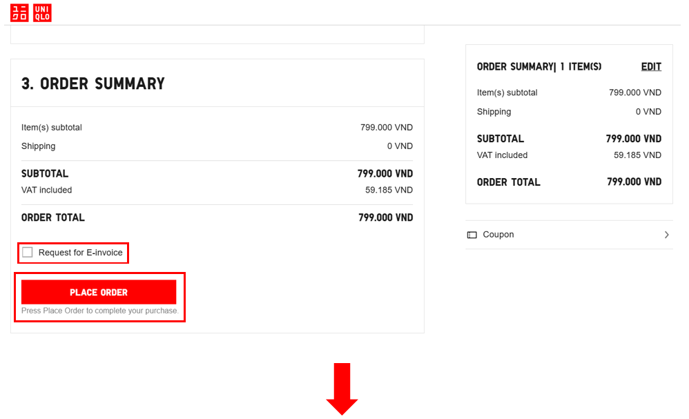 Please check your order information before clicking “Place Order”. If you need a VAT invoice, please click on the box “Request for E-invoice” and fill in your business information.